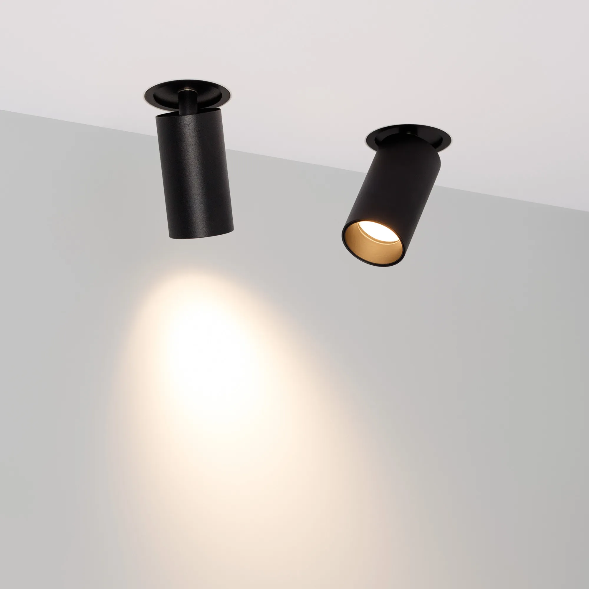Светильник встраиваемый поворотный. Мощность 7 Вт, св. поток 490 лм, 70 лм/Вт, теплый 3000 K, CRI>90, угол 36°, напряжение питания 230 В. Черный круглый корпус из алюминия, экран PMMA, степень защиты IP40. Размер: диаметр 35 мм, высота светового модуля 65 мм. Угол поворота 360°, угол наклона 90°. Монтаж встраиваемый, установочное отверстие: диаметр 55 мм, глубина 73 мм. Драйвер в комплекте 27-50 В, 150 мA, пульсация <1%.