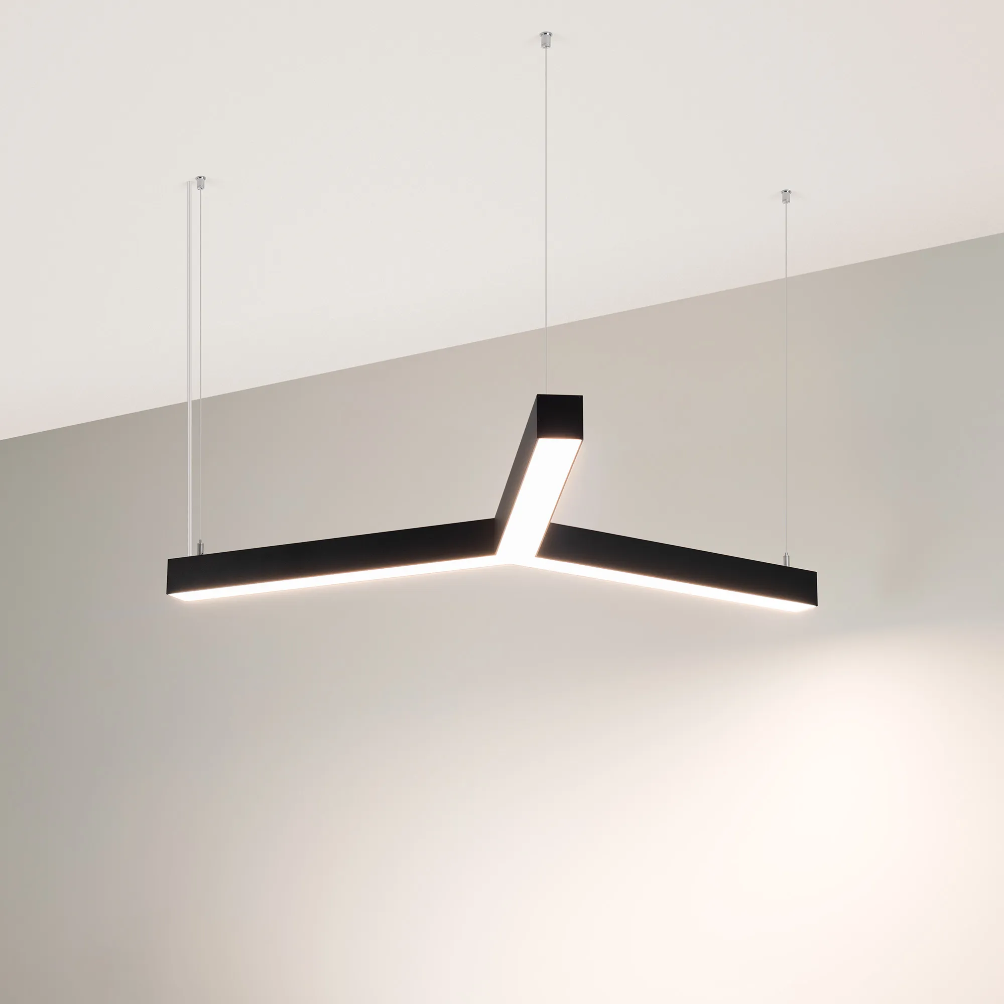 Светильник 3 ЛУЧА из профиля SL-LINE-5050-2000 ANOD, цвет Day4000K (Лента в 2 ряд(а)), световой поток - 1415 лм. Габаритные размеры светильника 790х910х50 мм (длина одного луча 510 мм), сечение профиля 50х50 мм. Способ установки - подвесной 2 м. Цвет корпуса - Черный RAL9005. Степень защиты IP33. Мощность 34 Вт, питание 170-265 В. В комплекте 1 встроенный блок питания, подвесы 2 м и кабель. Гарантия 3 год(а). Поставка в сборке.