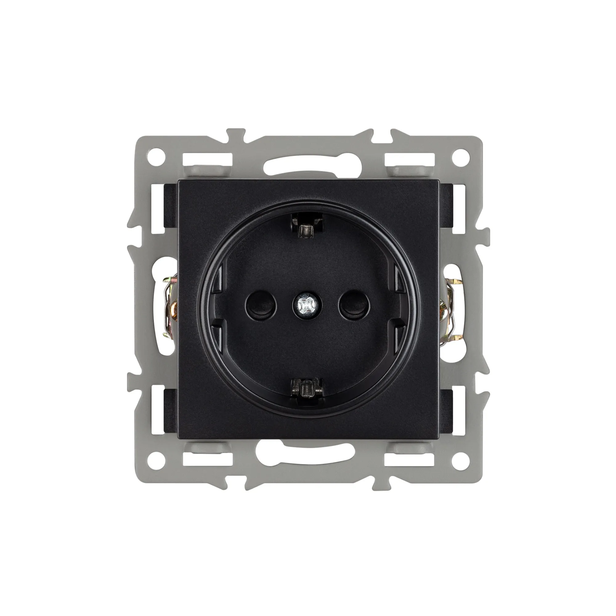 Механизм розетки с заземлением 1 пост, с суппортом из алюминия. Цвет - черный. Степень пылевлагозащиты - IP20.