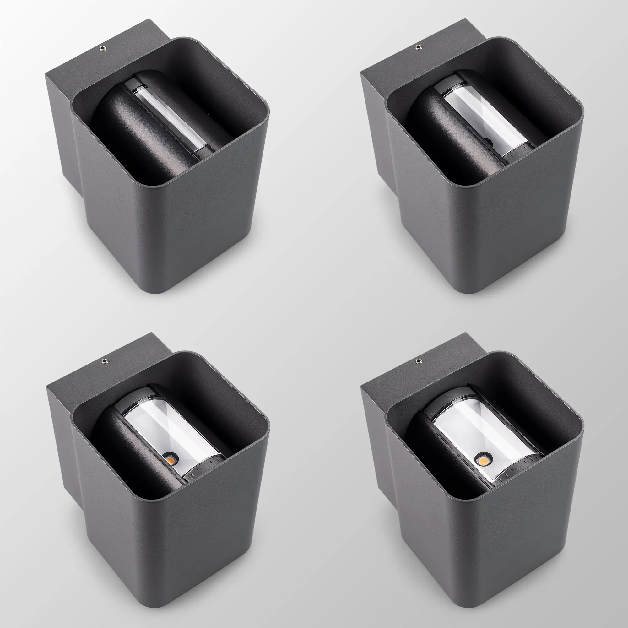Накладной настенный светильник, свечение вверх/вниз. Мощность 12 Вт, св. поток 820 лм, 68 лм/Вт, теплый 2700 K, CRI>80, изменяемый угол освещения 0°-80°, напряжение питания 230 В. Темно-серый фигурный корпус из алюминия, экран ударопрочный PC, степень защиты IP54. Размер: длина 138 мм, ширина 104 мм, высота 129 мм. Монтаж накладной. Драйвер встроенный, пульсация <2%.