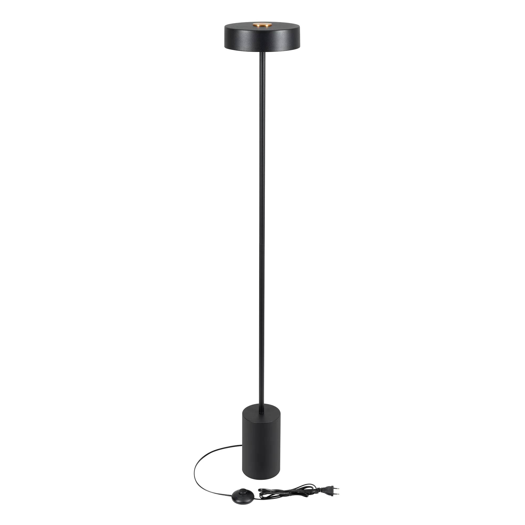 Декоративный напольный светильник. Мощность 16 Вт, св. поток 1230 лм, 76 лм/Вт, теплый 3000 K, CRI>90, угол 110 °. Фигурный корпус из стали черного цвета, матовый экран PMMA, степень защиты IP20. Размер светоизлучателя: Ø200х54 мм; размер основания: Ø120 x 200 мм; размер ножки: Ø16,4 x 1100 мм; общая высота: 1354 мм. Пульсация < 2%. Длина провода 2400 мм, питание от сети AC 220-240V.