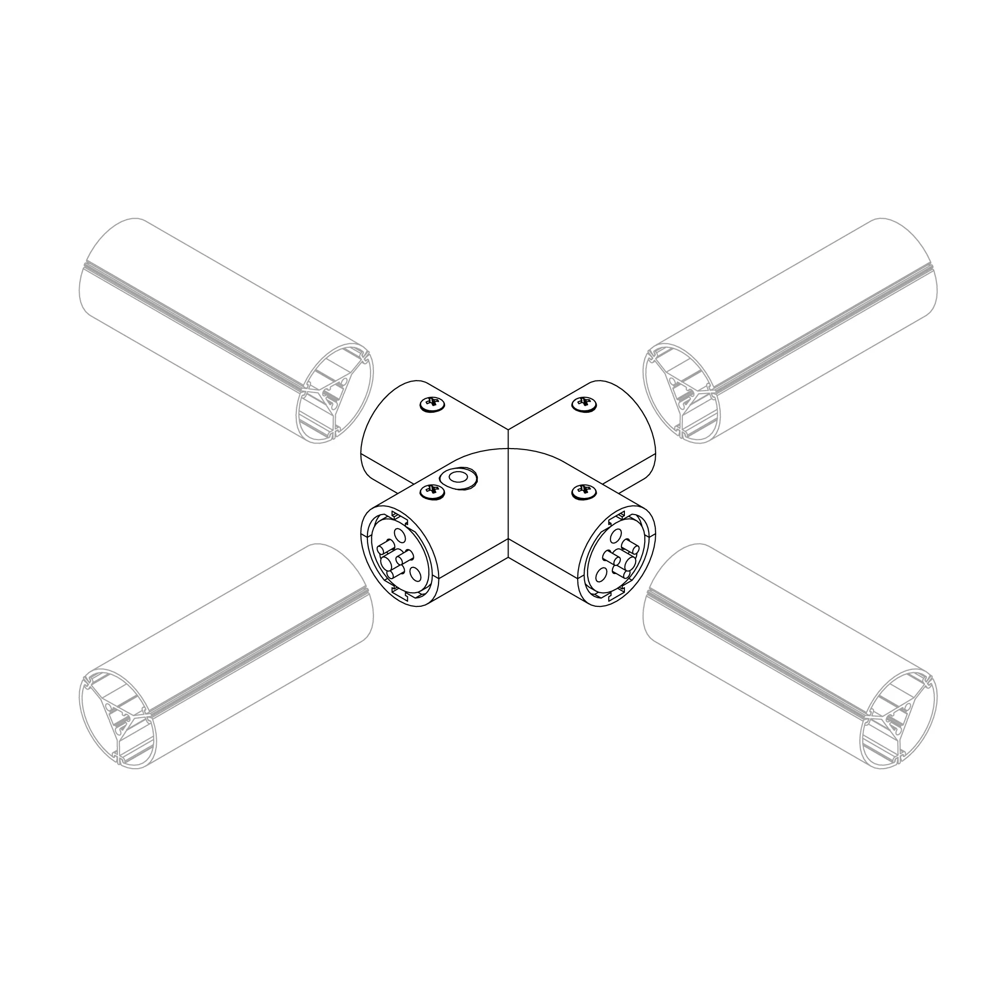 Крестовой коннектор для соединения 4-х отрезков профиля ROUND-D36-360 под углом 90° с отверстием для вывода кабеля питания. В комплекте: соединитель крестообразный - 1 шт., втулка - 4 шт., винт длинный - 4 шт., винт короткий - 12 шт., гермоввод - 1 шт. Цена за комплект.