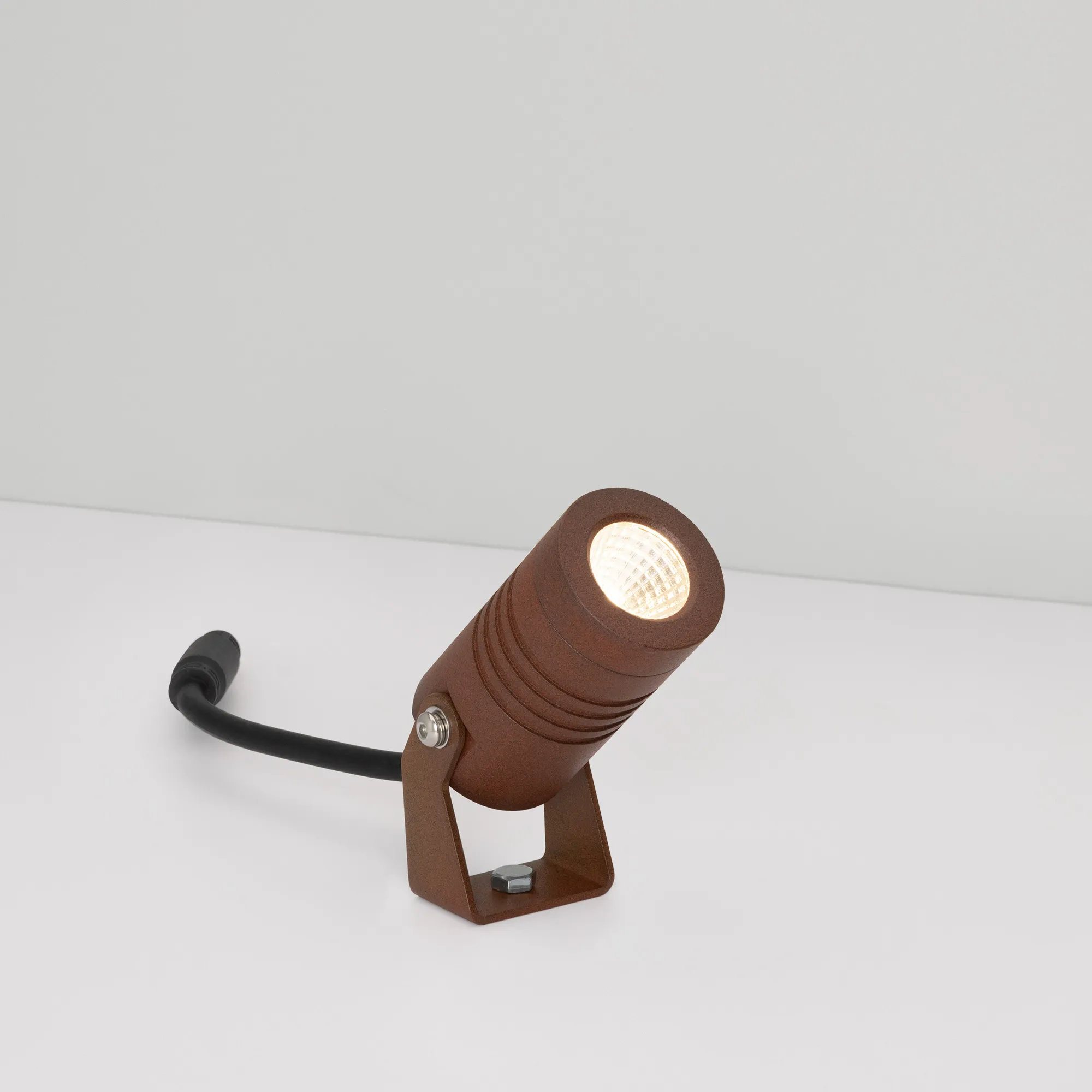 Уличный светодиодный прожектор, мощность 5Вт, угол освещения 25°. Цвет ДНЕВНОЙ 4000К, световой поток 310лм. Влагозащищенный корпус IP67 - цвет кортен - алюминий, экран из закалённого стекла. Угол поворота корпуса в вертикальной плоскости 135°. Питание 230В, мощность 5 Вт. Размеры DxH -Ø42х77мм. В комплекте 1м провод.