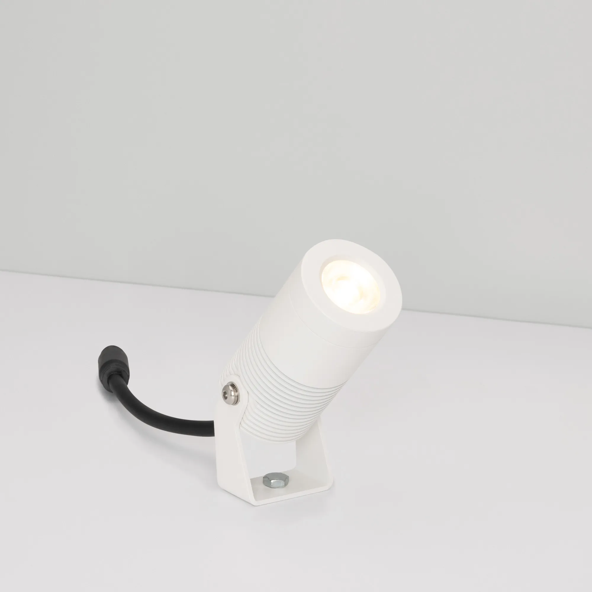 Уличный светодиодный прожектор, мощность 8Вт, угол освещения 33°. Цвет ТЕПЛЫЙ 3000К, световой поток 580лм. Влагозащищенный корпус IP67 - белый алюминий, экран из закалённого стекла. Угол поворота корпуса в вертикальной плоскости 135°. Питание 230В, мощность 8 Вт. Размеры DxH -Ø44х90мм. В комплекте 1м провод.