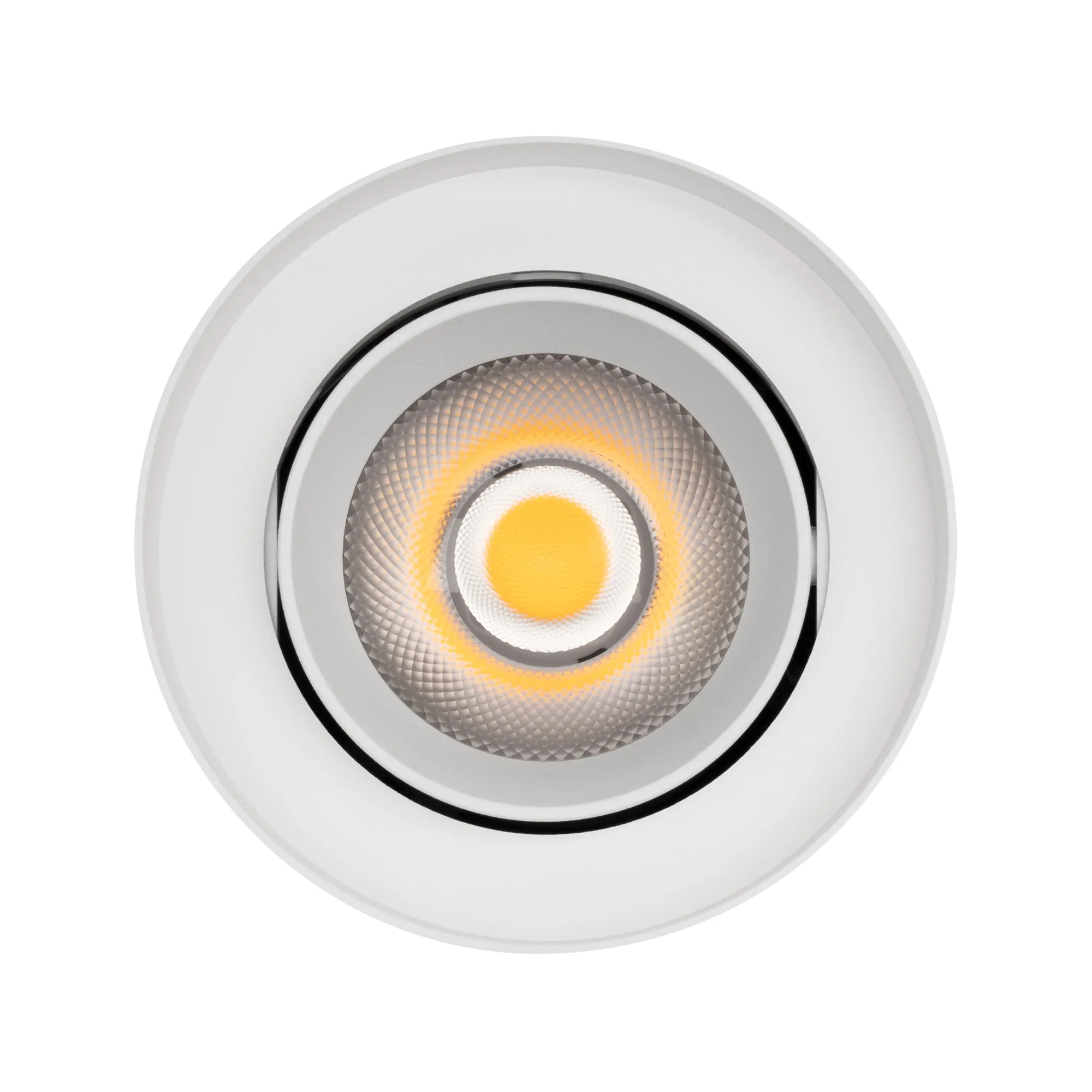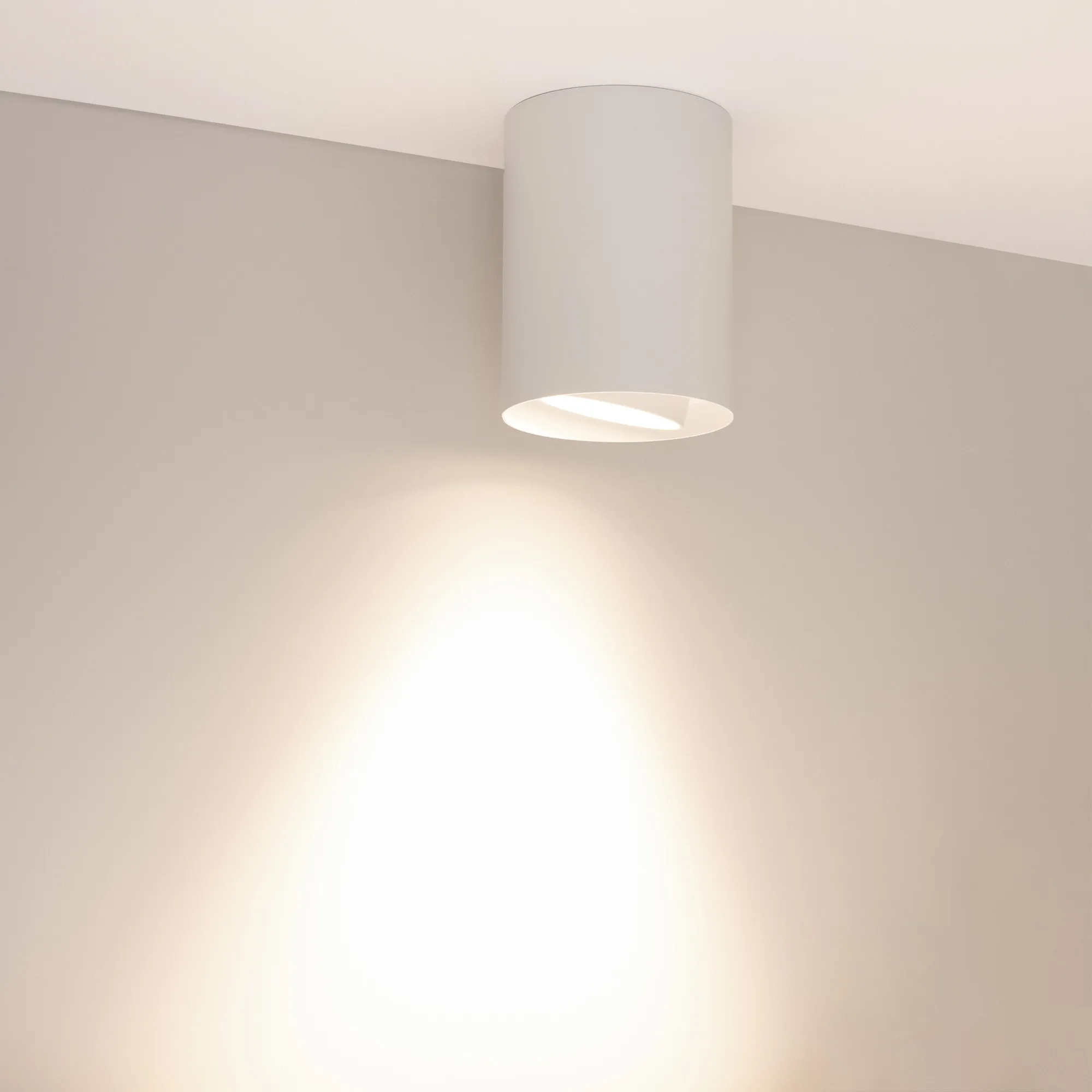 Накладной интерьерный светильник. Мощность 18 Вт, св. поток 1700 лм, 99 лм/Вт, дневной 4000 K, CRI>90, угол 50°, регулируемое направление луча 40°(20+20), поворотный световой модуль вокруг своей оси на 340°, UGR <11, напряжение питания 230 В. Белый круглый корпус из алюминия, степень защиты IP54. Размер: диаметр 110 мм, высота 145 мм. Монтаж накладной. Драйвер 27-43 В, 450 мА, пульсация <1%.