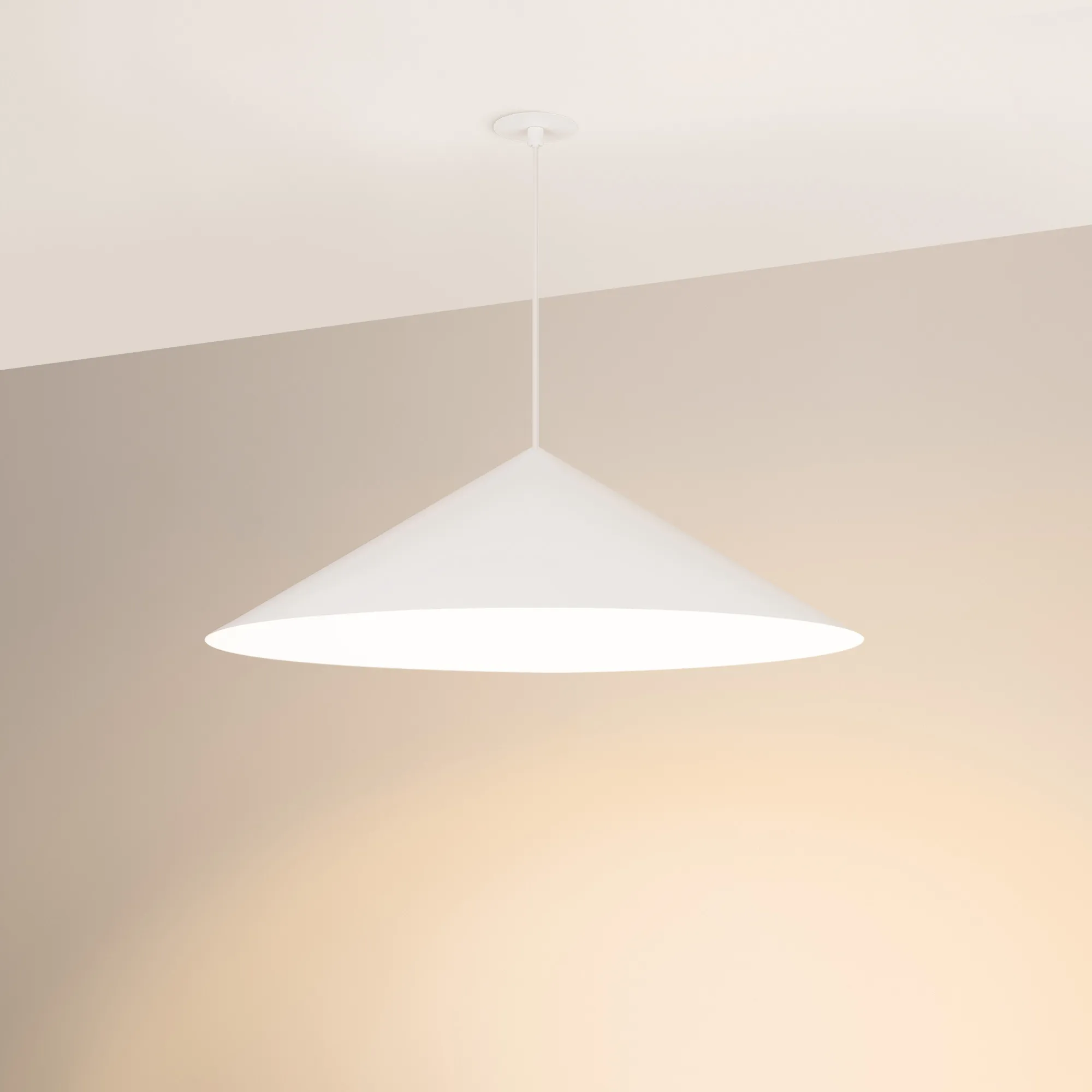Подвесной светильник. Мощность 14 Вт, св. поток 1200 лм, 90 лм/Вт, теплый 2700K, CRI>97, угол 36°, напряжение питания 230 В. Белый корпус из алюминия в форме конуса с белой внутренней поверхностью, линза-рассеиватель из PMMA, степень защиты IP20. Размер: диаметр 750 мм, высота 230 мм. Монтаж подвесной, длина подвеса 2000 мм, регулируемая. В комплекте 2 вида чаш. Габариты встраиваемой чаши: Ø 80x23 мм. Габариты накладной чаши Ø140x55 мм. Драйвер 27-42 В, 350 мА, пульсация <1%. Управление по TRIAC.