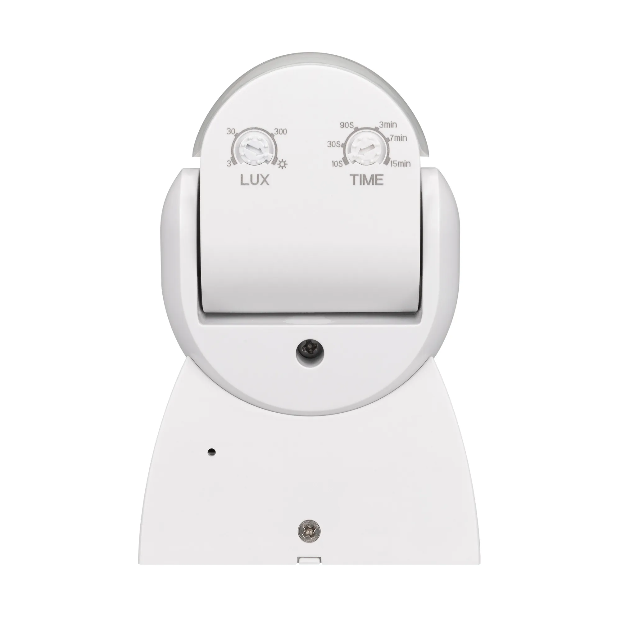 Инфракрасный датчик движения, совмещенный с датчиком освещенности. Высота установки - 1.8 - 2.5 м. Угол обнаружения 180°. Настройки: время отключения (10 c – 15 мин), максимальная зона срабатывания 12 м, освещенность (3 - 2000 люкс). Максимальная нагрузка 1200 Вт (для ламп накал-я и галогенных), 300 Вт (для светодиодных и люминесцентных ламп), размеры (LxWxH) - 119х80х51.5 мм.