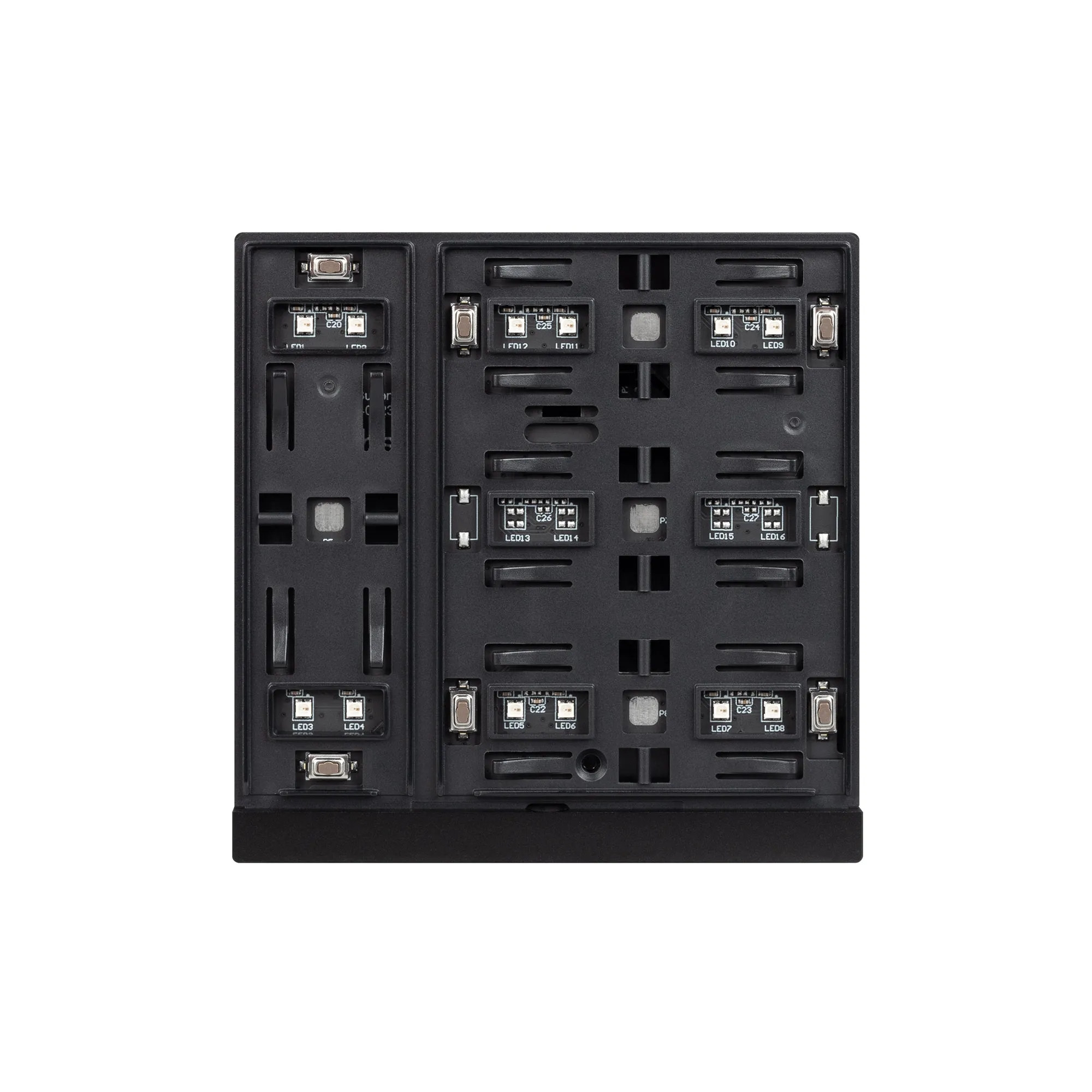 Механизм универсальной многофункциональной встраиваемой настенной панели для систем KNX. 3 клавиши, светодиодная индикация. Наличие функции KNX Secure. Безрамочный корпус черного цвета, материал - пластик, светодиодная индикация (настраиваемая RGB палитра индикации). В механизме панели предусмотрено 2 дополнительных бинарных входа для подключения датчиков температуры NTC или выключателей. Питание от шины KNX DC 21-30V. Габариты 86x86x33 мм.