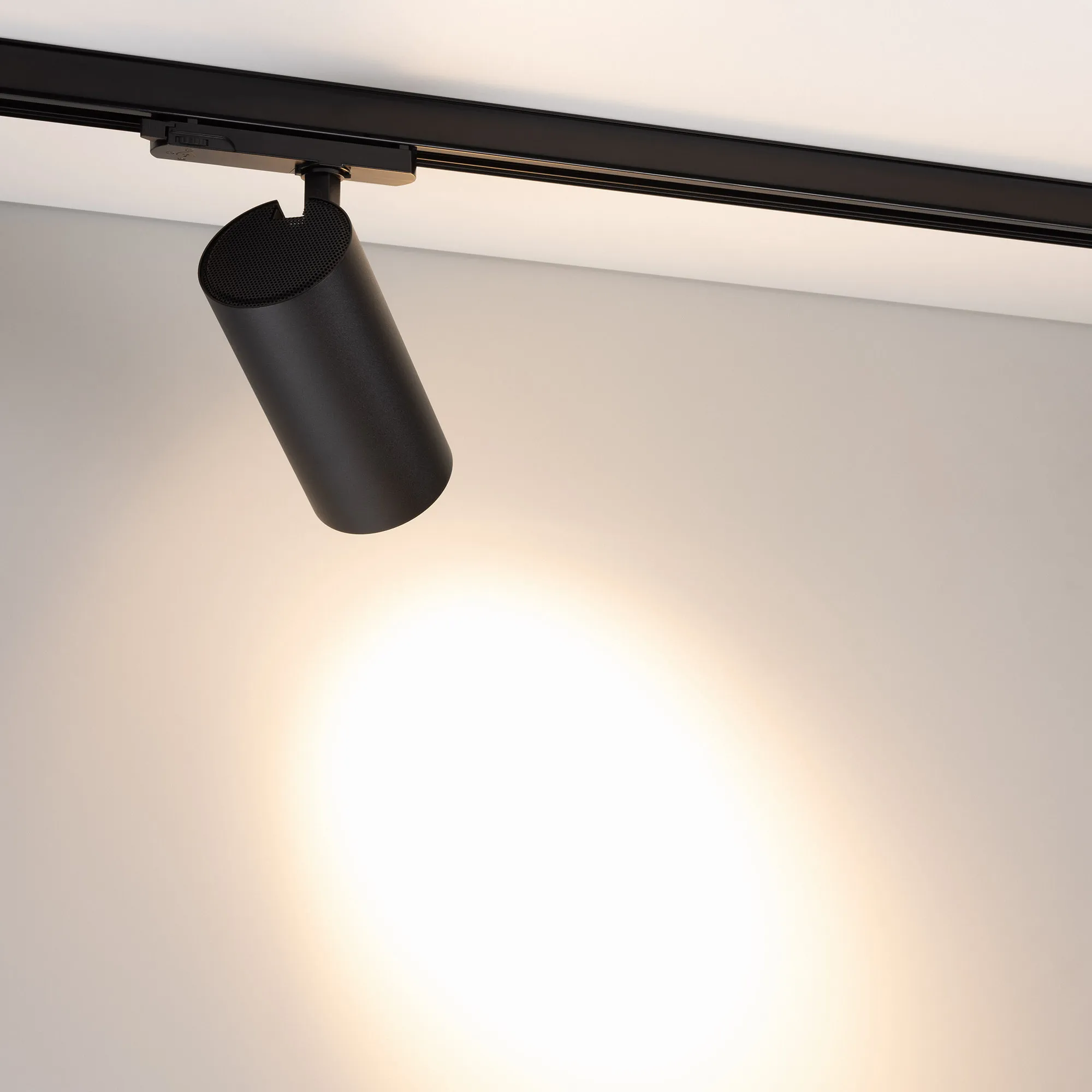 Светильник для треков/шин 4 провода. Мощность 30 Вт, св. поток без решетки honeycomb 3000 лм, 100 лм/Вт, с решеткой honeycomb 1980 лм, 66 лм/Вт, теплый 3000 K, CRI>90, угол 24°, напряжение питания 230 В. Черный круглый корпус из алюминия, материал линзы PMMA, степень защиты IP20. Размер: диаметр 90 мм, длина световой части 141 мм. Монтаж на трек 3-фазный. Драйвер встроенный 24-42 В, 750мА., пульсация <5%