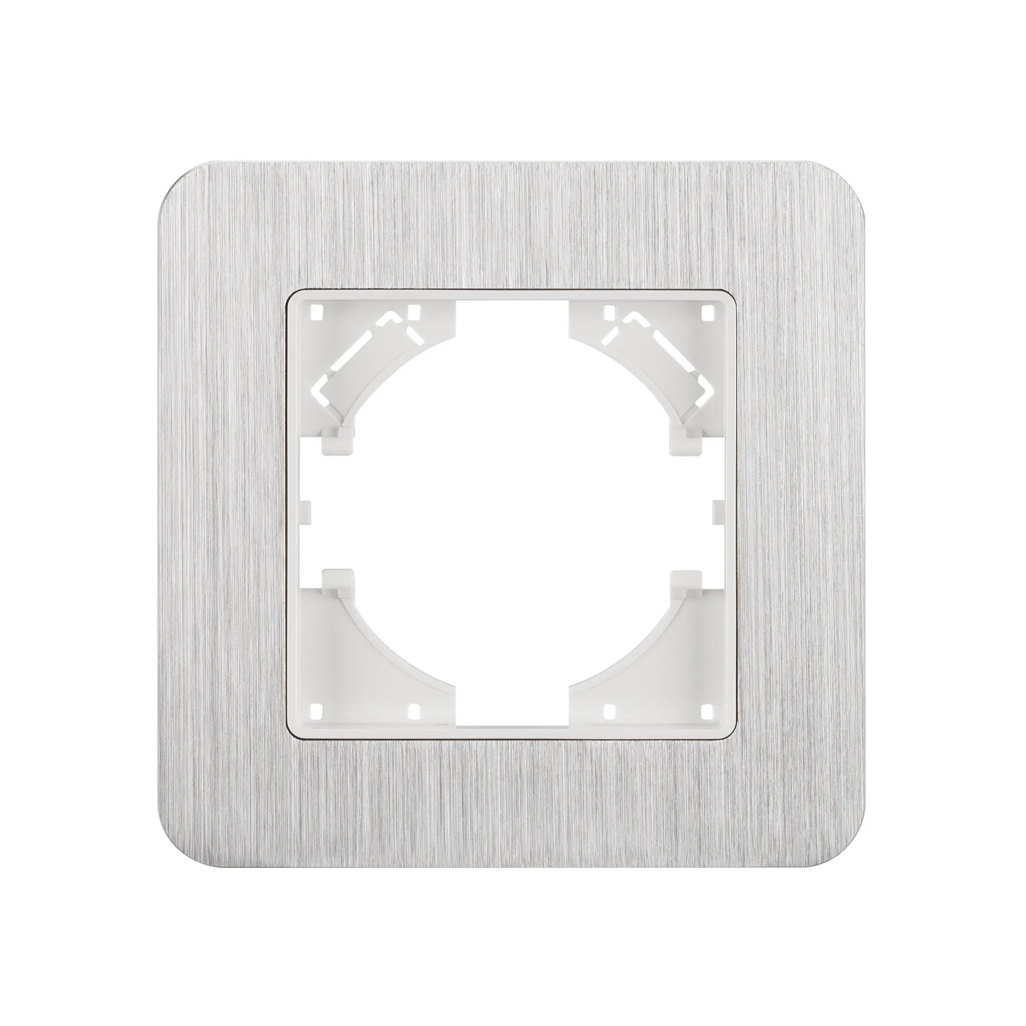 Рамка алюминиевая на 1 пост, под встраиваемый механизм. Цвет - серебристый. Уровень герметичности IP20. Ориентация монтажа - горизонтальная (основным ориентиром служат посадочные выступы для накладки механизма).