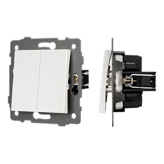 Механизм выключателя света клавишный на 1 пост 2 клавиши (непроходной). Цвет - белый. Без фронтальной рамки. Уровень пылевлагозащиты IP20. Выключатель устанавливается в стандартный круглый подрозетник.