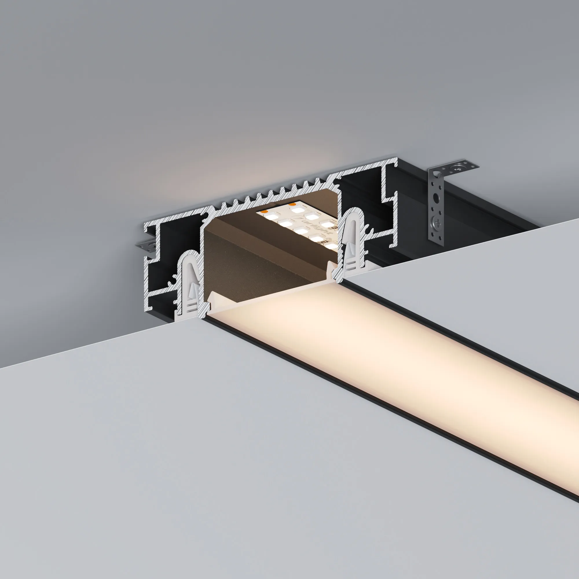 Алюминиевый профиль черного цвета для натяжных потолков (центральная линия). Решение 2-в-1 - каркас для крепления натяжного потолка и профиль для установки светодиодной ленты. Для дизайнерских решений «линии света» в натяжных потолках. Подходит для тканевых и ПВХ потолков. Монтируется к потолку накладным способом. Ширина площадки для ленты 38,3 мм. Длина 2000 мм. Цена за 1 м.
