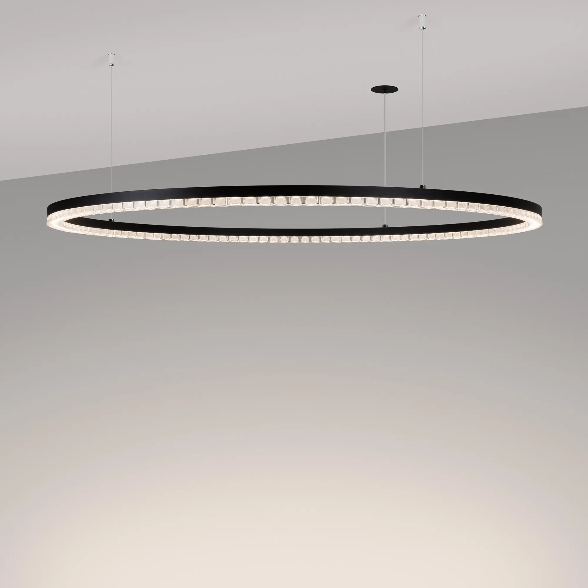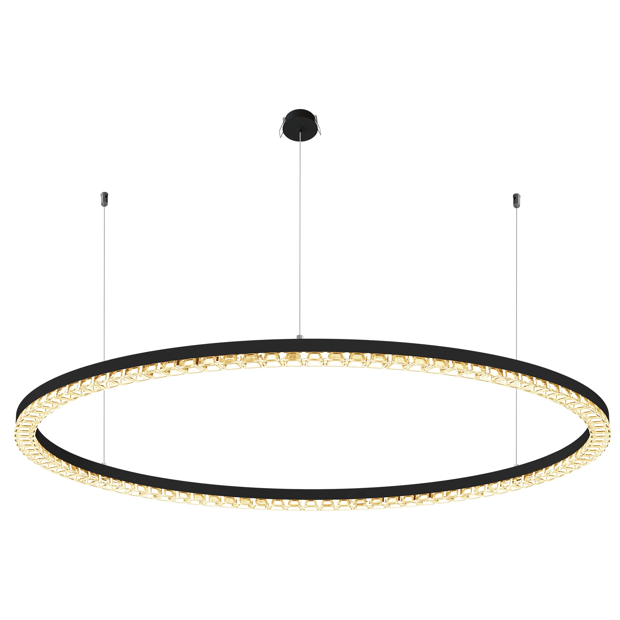Подвесной светильник. Мощность 80 Вт, св. поток 7010 лм, 80-95 лм/Вт, дневной белый 4000 K, CRI>90, угол 45°, напряжение питания 230 В. Черный круглый корпус из алюминия, экран PMMA, степень защиты IP20. Размер: диаметр 1250 мм, высота 34 мм, ширина профиля 30 мм, размер чаши: диаметр 65 мм, высота 26 мм. Монтаж подвесной, длина подвеса 1200 мм, тип чаши встраиваемый, диаметр установочного отверстия чаши 60 мм. Драйвер (2 шт) 9-38 В, 1050 мА. Пульсация <0,3 %.