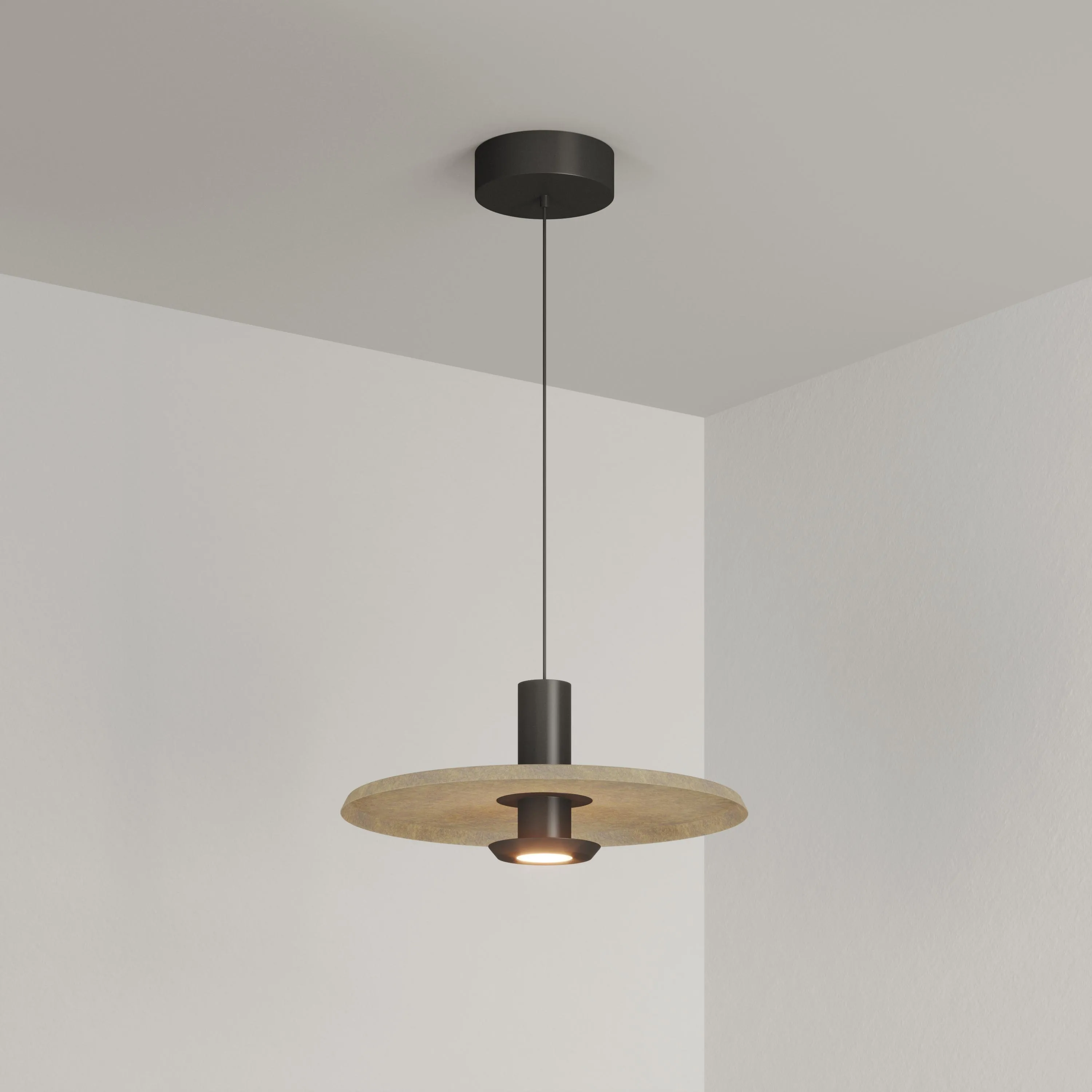 Подвесной светильник. Мощность 12 Вт, св. поток 597 лм, 49 лм/Вт, теплый 2700 K, CRI>94, угол 36°, напряжение питания 230 В. Бежевый фигурный корпус из переработанного фетра с бежевой внутренней поверхностью, линза-рассеиватель из PMMA, степень защиты IP20. Размер: диаметр 350 мм, высота 145 мм. Монтаж подвесной, длина подвеса 2000 мм, регулируемая. В комплекте 2 вида чаш. Габариты чаши (встраиваемая) Ø80 х 23 мм, врезное отверстие Ø60 мм. Габариты чаши (накладная) Ø120 x 35 мм. Драйвер 59 В, 300 мА, пульсация <1%. Управление по TRIAC.