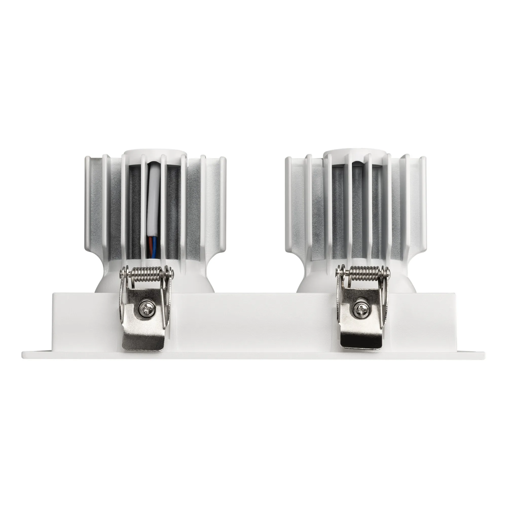 Встраиваемый карданный светильник. Мощность 2х12 Вт, св. поток 2788 лм, 116 лм/Вт, тёплый 3000 K, CRI>92, угол 40°, напряжение питания 230 В. Белый корпус из алюминия, белая вставка, степень защиты IP20. Размер: длина 170 мм, ширина 90 мм, высота 80 мм. Монтаж встраиваемый, установочное отверстие: длина 155 мм, ширина 75 мм. Драйвер 27-40 В, 300 мА, пульсация <2%.
