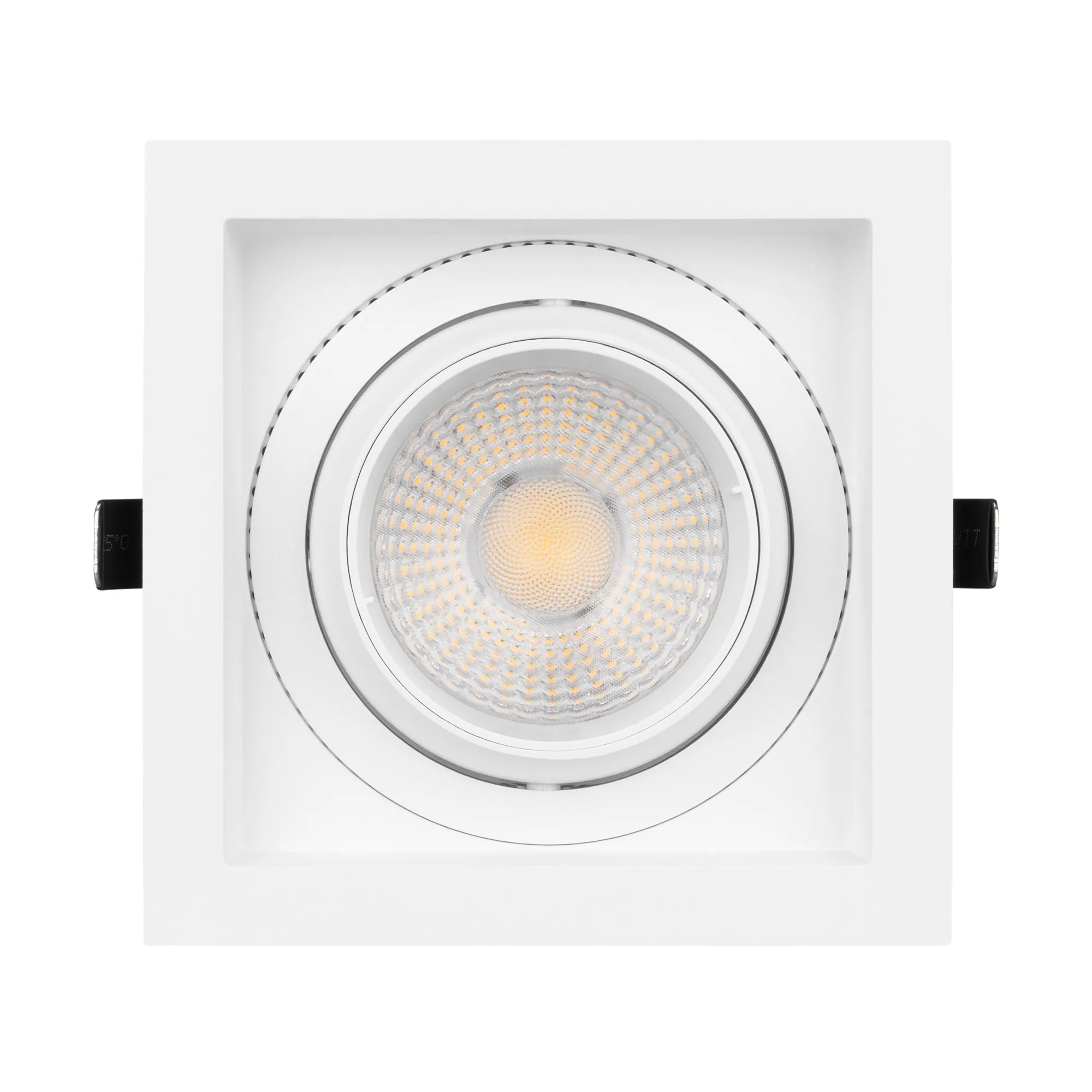 Встраиваемый карданный светильник. Мощность 30 Вт, св. поток 2650 лм, 88 лм/Вт, тёплый 3000 K, CRI>92, угол 50°, напряжение питания 230 В. Белый корпус из алюминия, белая вставка, степень защиты IP20. Размер: длина 140 мм, ширина 140 мм, высота 125 мм. Монтаж встраиваемый, установочное отверстие: длина 120 мм, ширина 120 мм. Драйвер 24-42 В, 750 мА, пульсация <2%.