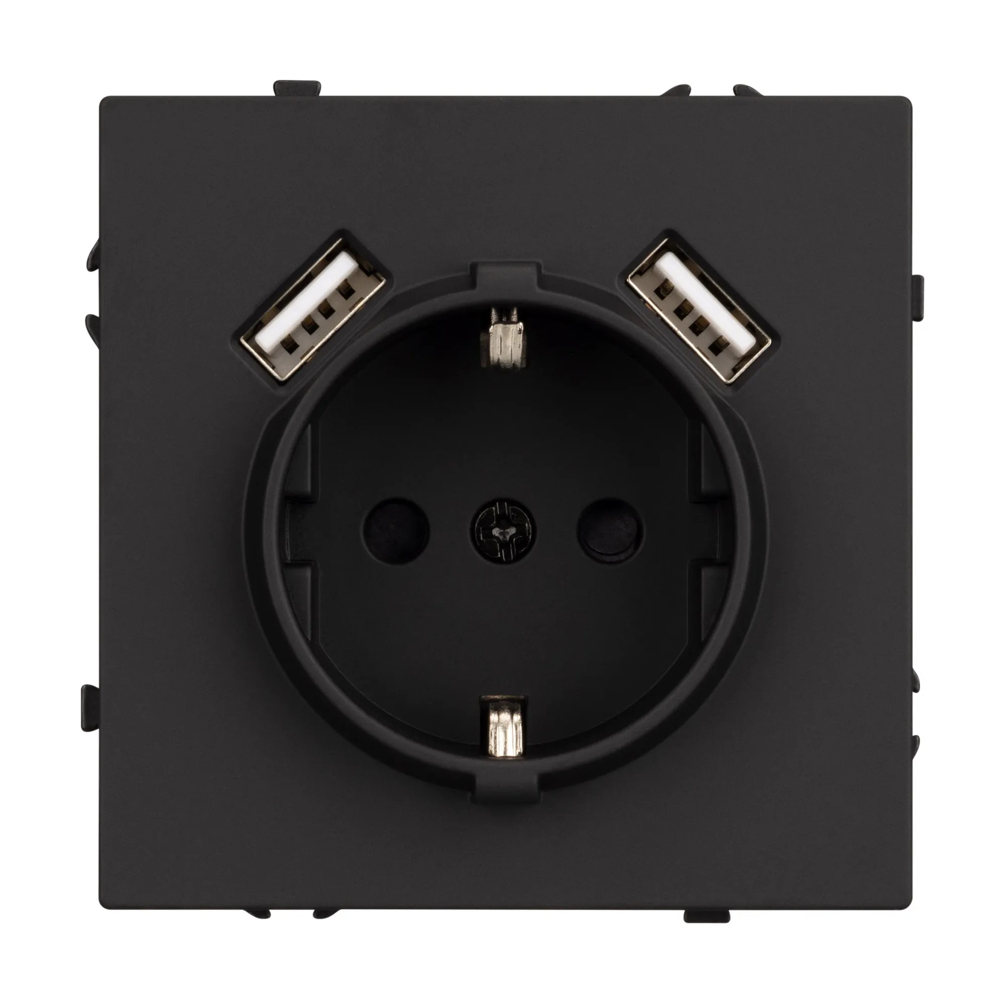 Механизм розетки с заземлением на 1 пост и 2USB Type A порта. Цвет - черный оникс, с Soft-Touch покрытием. Без фронтальной рамки. Уровень пылевлагозащиты IP20. Розетка устанавливается в стандартный подрозетник круглого сечения диаметром 60мм.