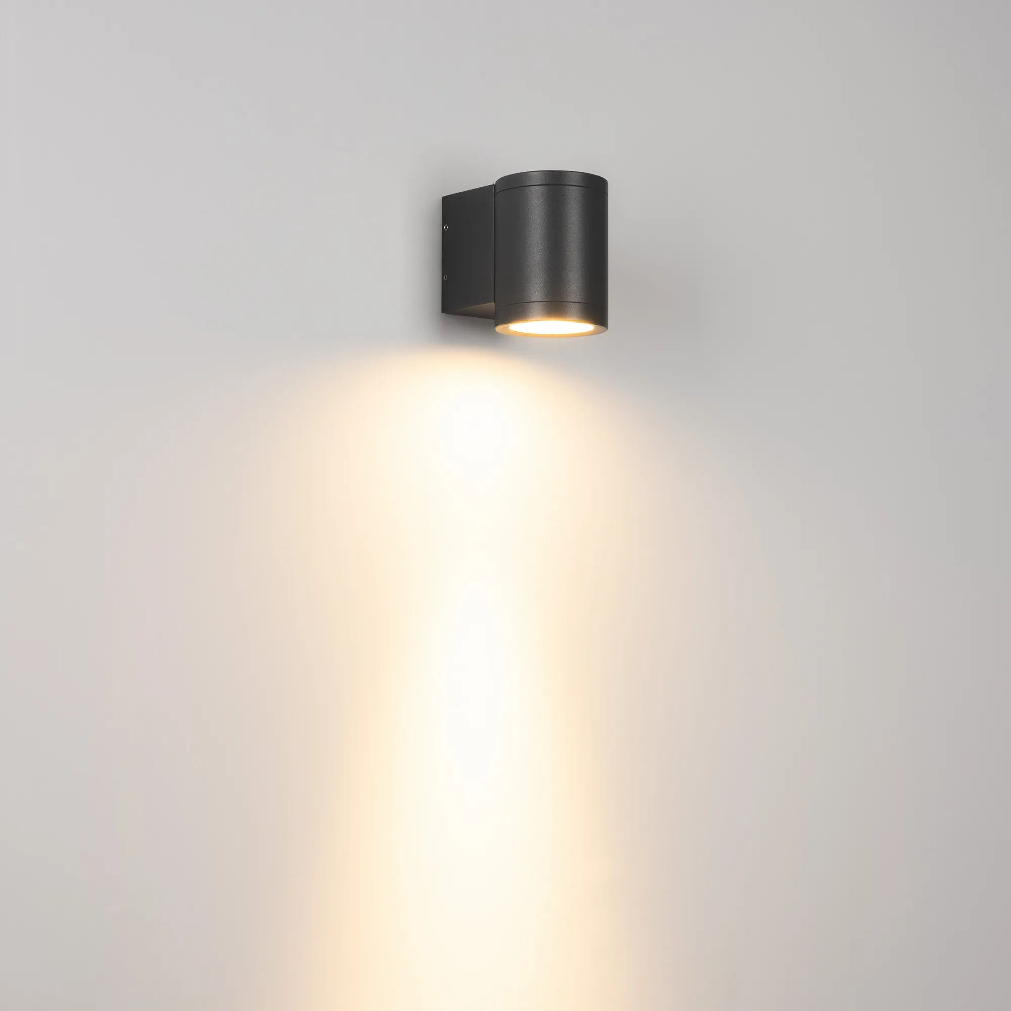 Накладной настенный светильник. Мощность 9 Вт, св. поток 860 лм, 95 лм/Вт, теплый 3000 K, CRI>80, угол 23°, напряжение питания 230 В. Темно-серый фигурный корпус из алюминия, экран стекло, степень защиты IP65. Размер: длина 98 мм, ширина 65 мм, высота 85 мм. Монтаж накладной. Драйвер встроенный, пульсация <2%.