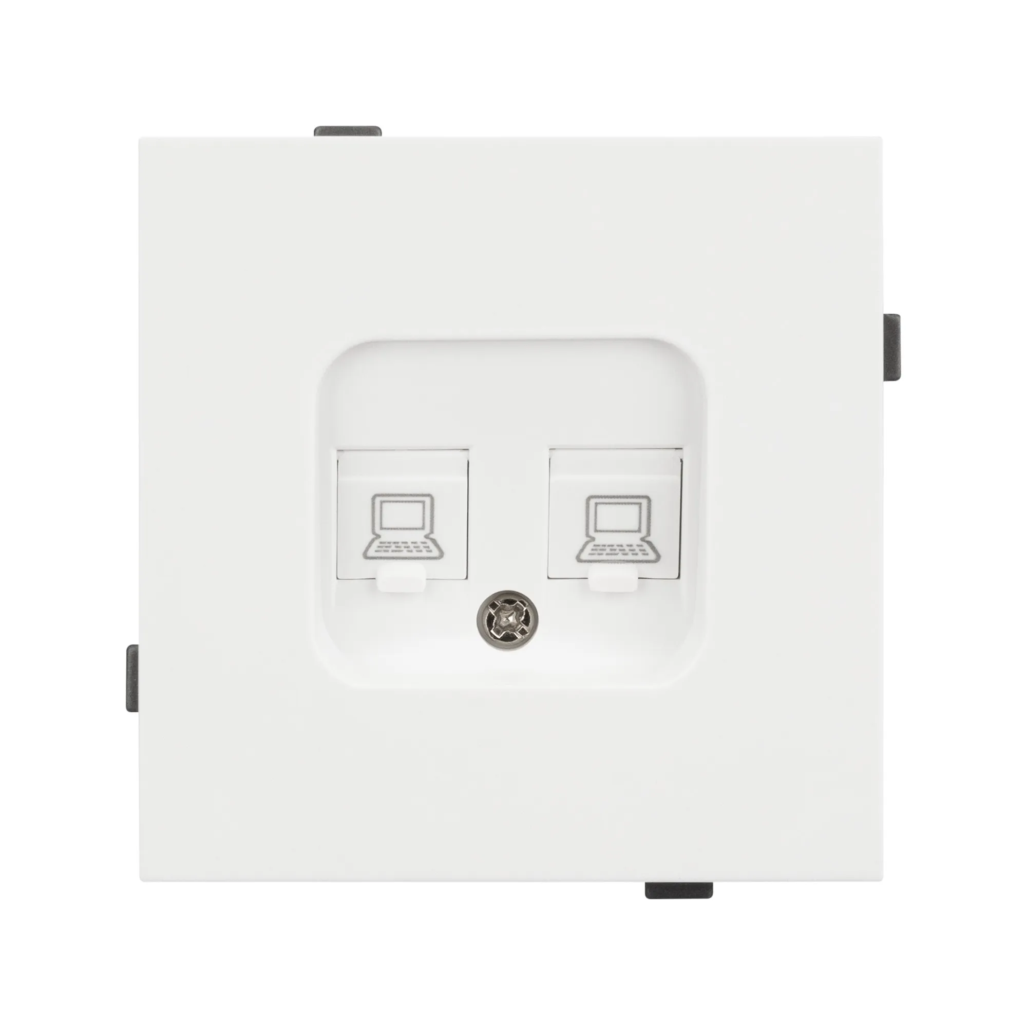 Механизм компьютерной розетки на 2 поста 6-й категории. Цвет - матовый белый, с Soft-Touch покрытием. Без фронтальной рамки. Уровень пылевлагозащиты IP20. Розетка устанавливается в стандартный подрозетник круглого сечения диаметром 60мм.