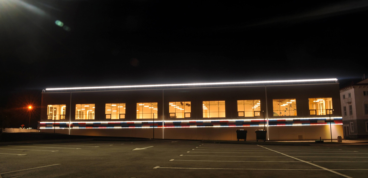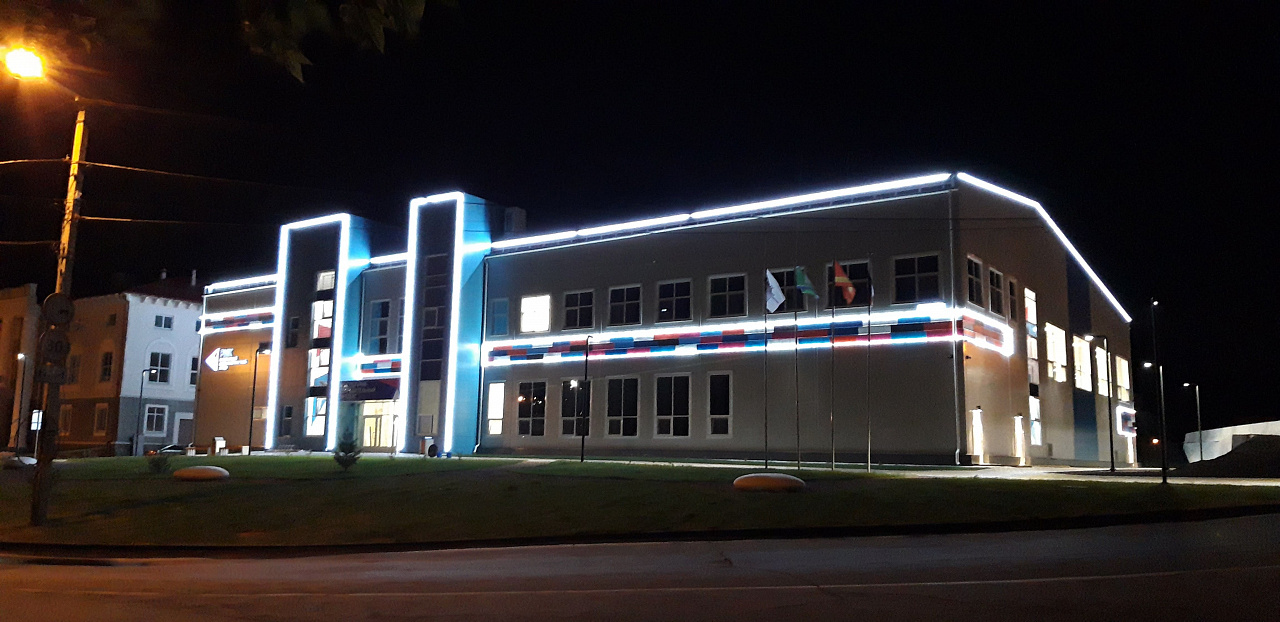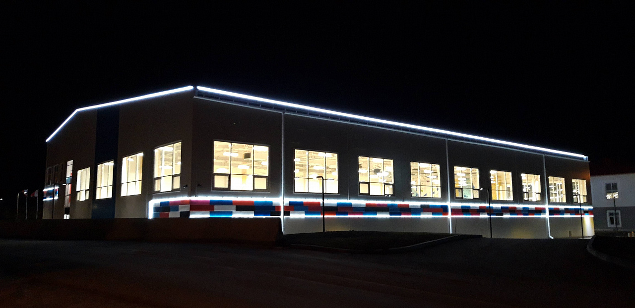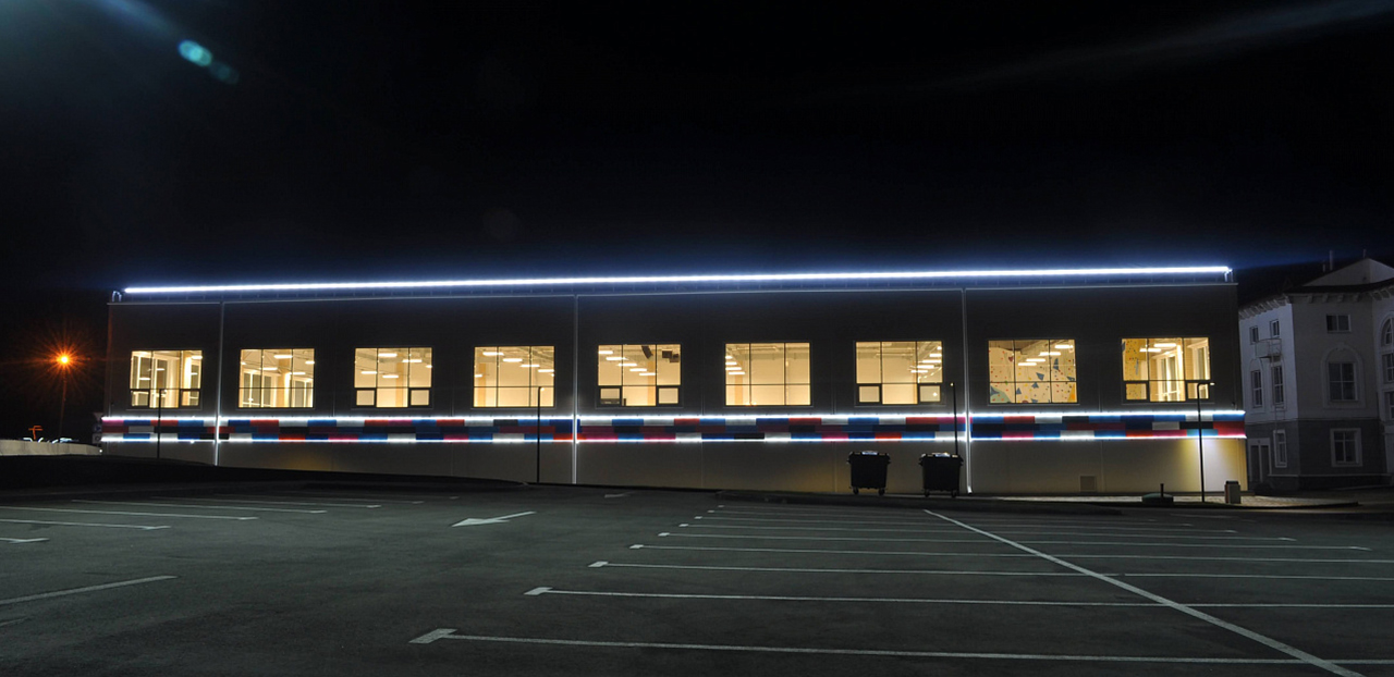 Светодиодная лента с цветом свечения, близким к свечению ясного северного неба (10 000 К), была применена для подсветки основных контуров здания. Это позволило выделить физкультурно-оздоровительный комплекс на фоне вечернего города.