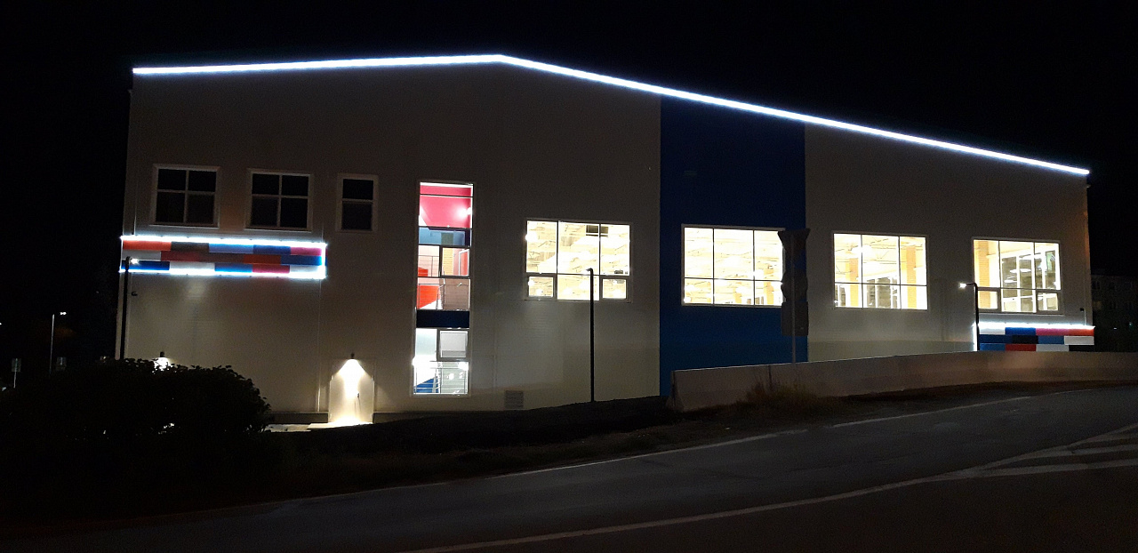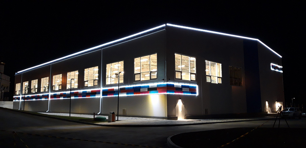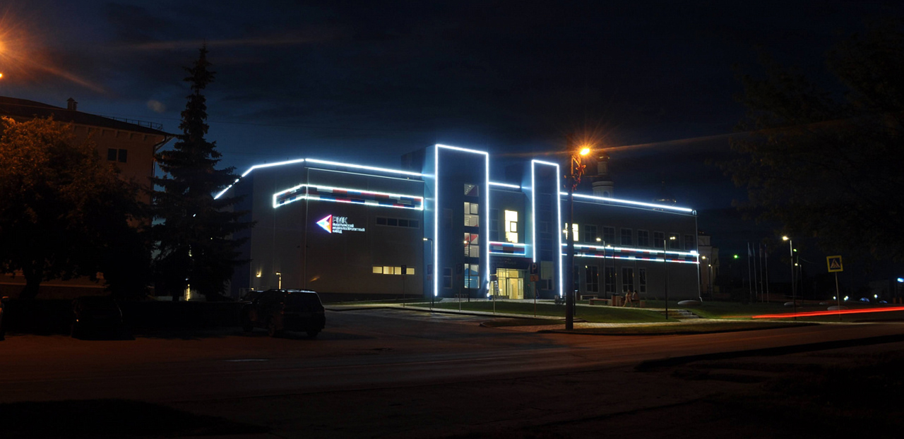 Контурная подсветка фасада — простое и в то же время беспроигрышное решение для зданий самого разного назначения. Именно этот прием освещения стал основным при оформлении физкультурно-оздоровительного комплекса АО «КЭМЗ» (АО «РМК»).