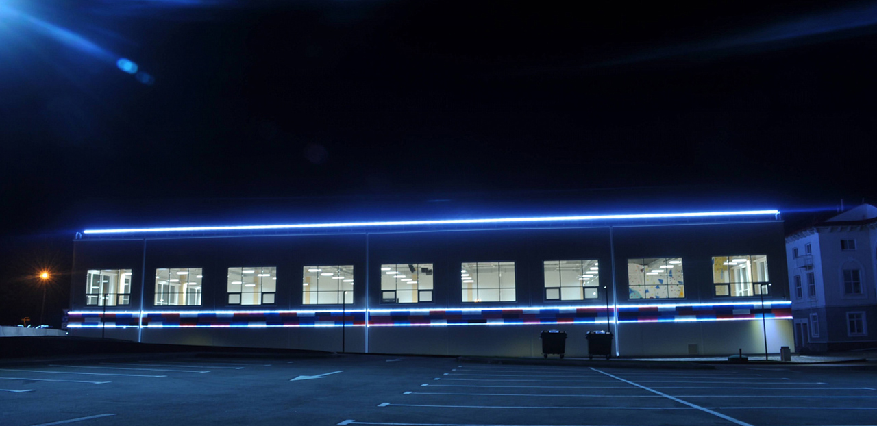 В обоих случаях лента уложена в алюминиевый профиль с опаловым экраном и рассчитана на напряжение 230 Вт, что позволило избежать установки дополнительных источников питания на фасаде.